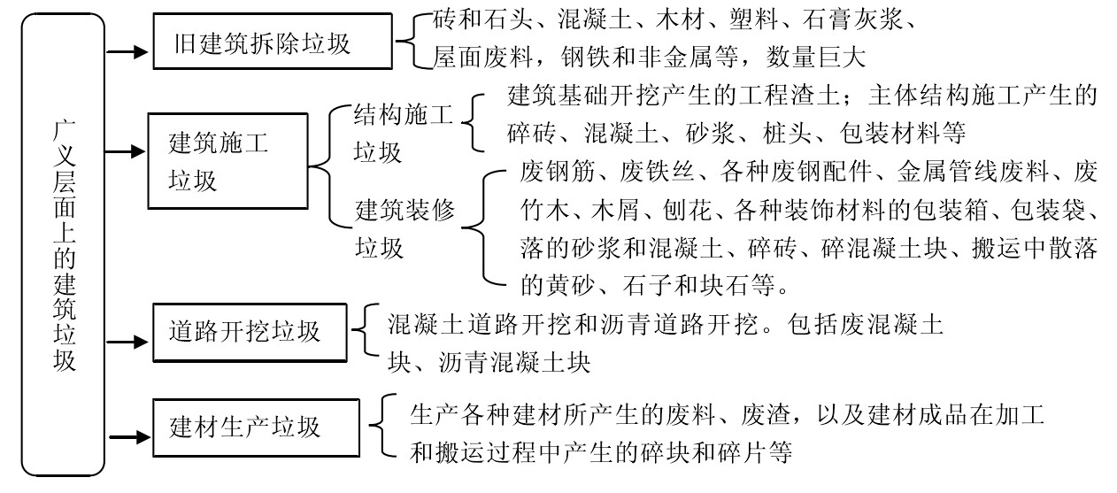 國內(nèi)學者對建筑垃圾給出的定義,把建筑垃圾分為六大部分,包括建筑物拆除下來的磚;舊建筑拆除后不能再使用的廢棄部分;建筑物施工過程中產(chǎn)生的廢棄物,如未用完木材、落地砂漿、混凝土、金屬制品、鋼筋頭、鋼材、塑料制品、小五金等;建筑物施工中開挖基礎的基坑土、邊坡土或碎石等;家庭裝修過程中產(chǎn)生的各類廢料;道路翻修產(chǎn)生的廢料。