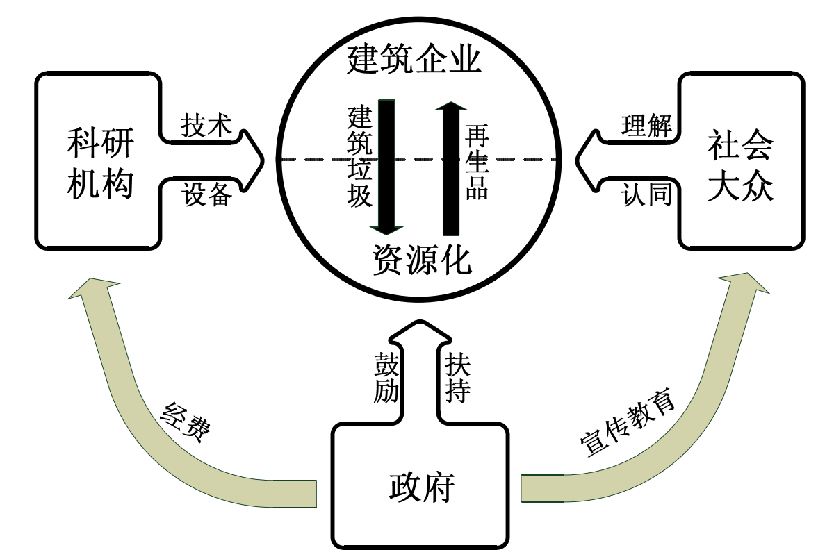 (二)政府與企業合作,提高建筑垃圾再利用率,從管理和技術等手段提高建筑垃圾中回收有用的物質和能源的使用率。目前在建筑垃圾使用上主要分成 3 種情況:1.可以直接從建筑垃圾中回收,不需要經過加工處理直接可以使用的資源,例如,廢塑料、廢紙板、廢竹木、廢金屬、廢玻璃等;2.需要對建筑垃圾重新進行生產,加工創造一種新材料,例如,利用房屋面瀝青作瀝青道路的鋪筑材料,利用混凝土塊生產再生混凝土骨料等;3.通過建筑垃圾焚燒生成能量進行發電來提高建筑垃圾的利用率。例如,通過建筑垃圾中廢竹木、廢紙板和廢塑料的焚燒處理回收熱量。